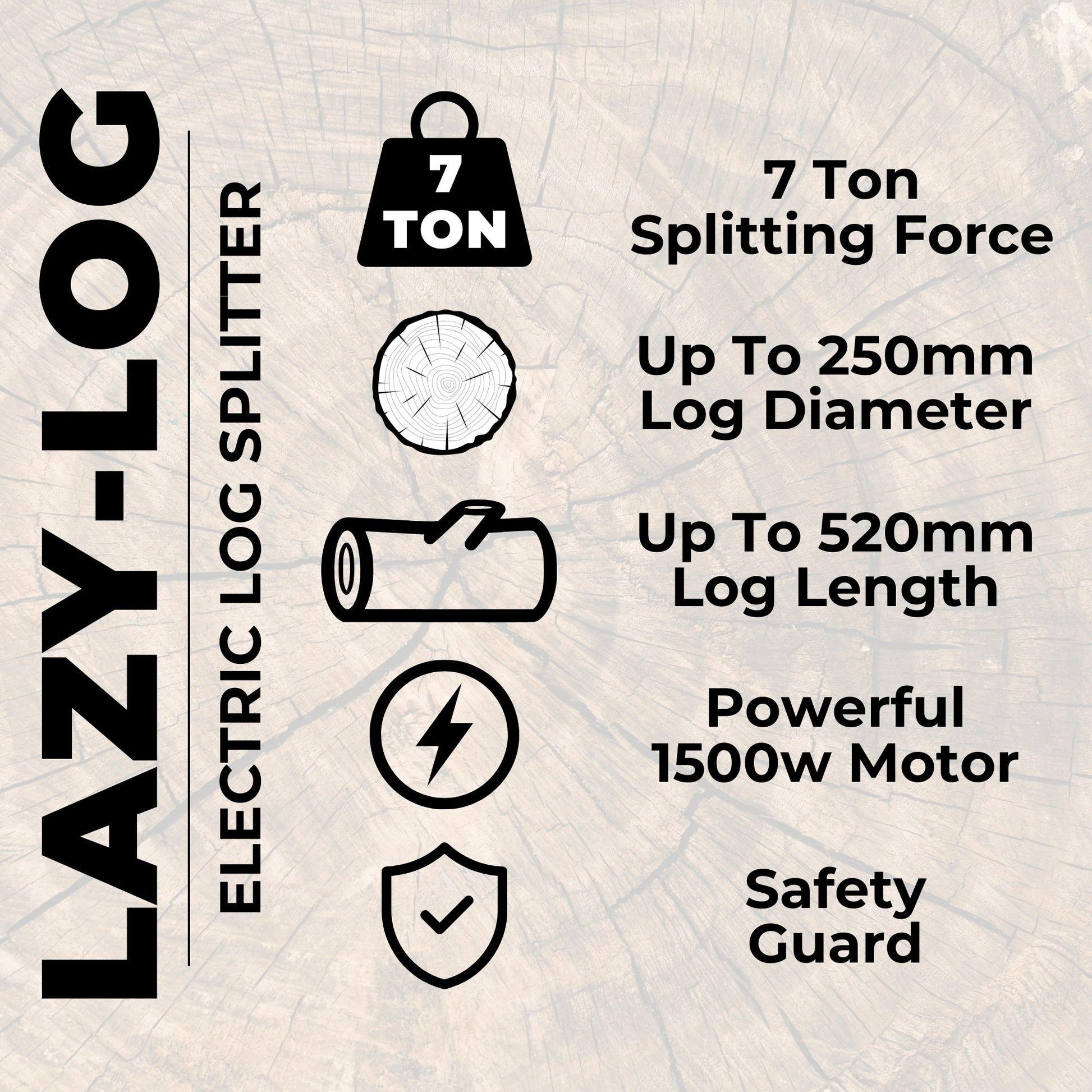 Once your logs are cut down to manageable lengths, the Lazy-Log 7 Ton Electric Log Splitter takes over. Its powerful 1500W electric motor and four-way wedge split logs up to 520mm long and 250mm wide into perfect pieces for your fireplace or wood burner.