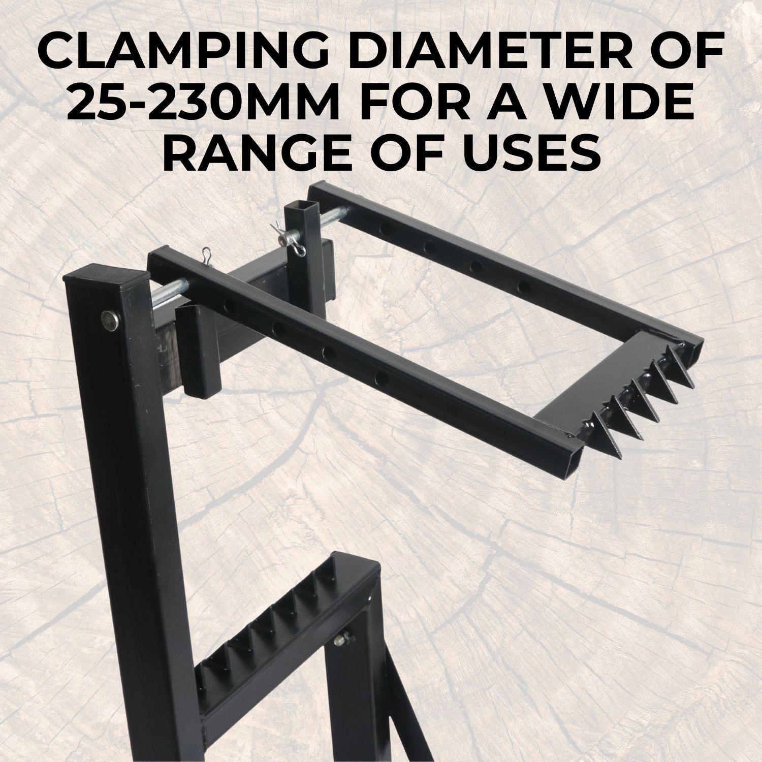 The Lazy-Log Saw Horse grips everything from branches and firewood to timber, beams, fence posts, and pallets. With a clamping range of 25 to 230 mm and a working height up to 1120 mm, it takes the strain off your back and keeps your hands away from danger. You focus on the cutting. It handles the holding.